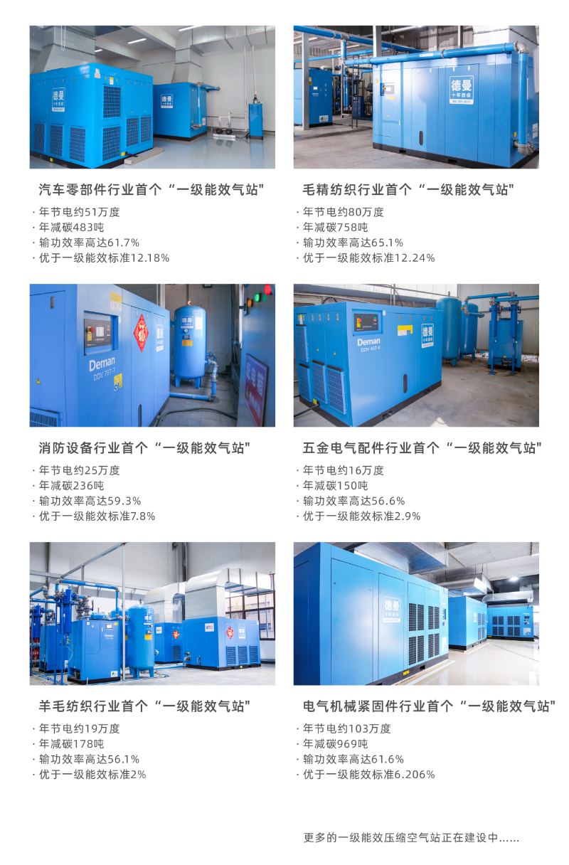 系统节能领域,德曼同样成绩可见称赞。面对我国压缩空气站普遍存在的系统效率低下难题,德曼凭借整厂用气六端解决方案,构建起全链路节能生态,成功打造多个行业首家“一级能效压缩空气站”。