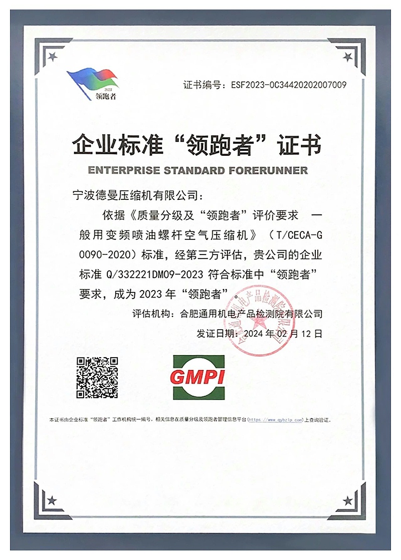 2023年,德曼荣获中国通用机械工业协会授予的“压缩空气系统节能突出贡献单位”,成为与欧美百年企业并列全球前三、中国唯一的国内品牌空气压缩机制造企业;创始人岑焕军也荣获“压缩空气系统节能领军人物”称号。